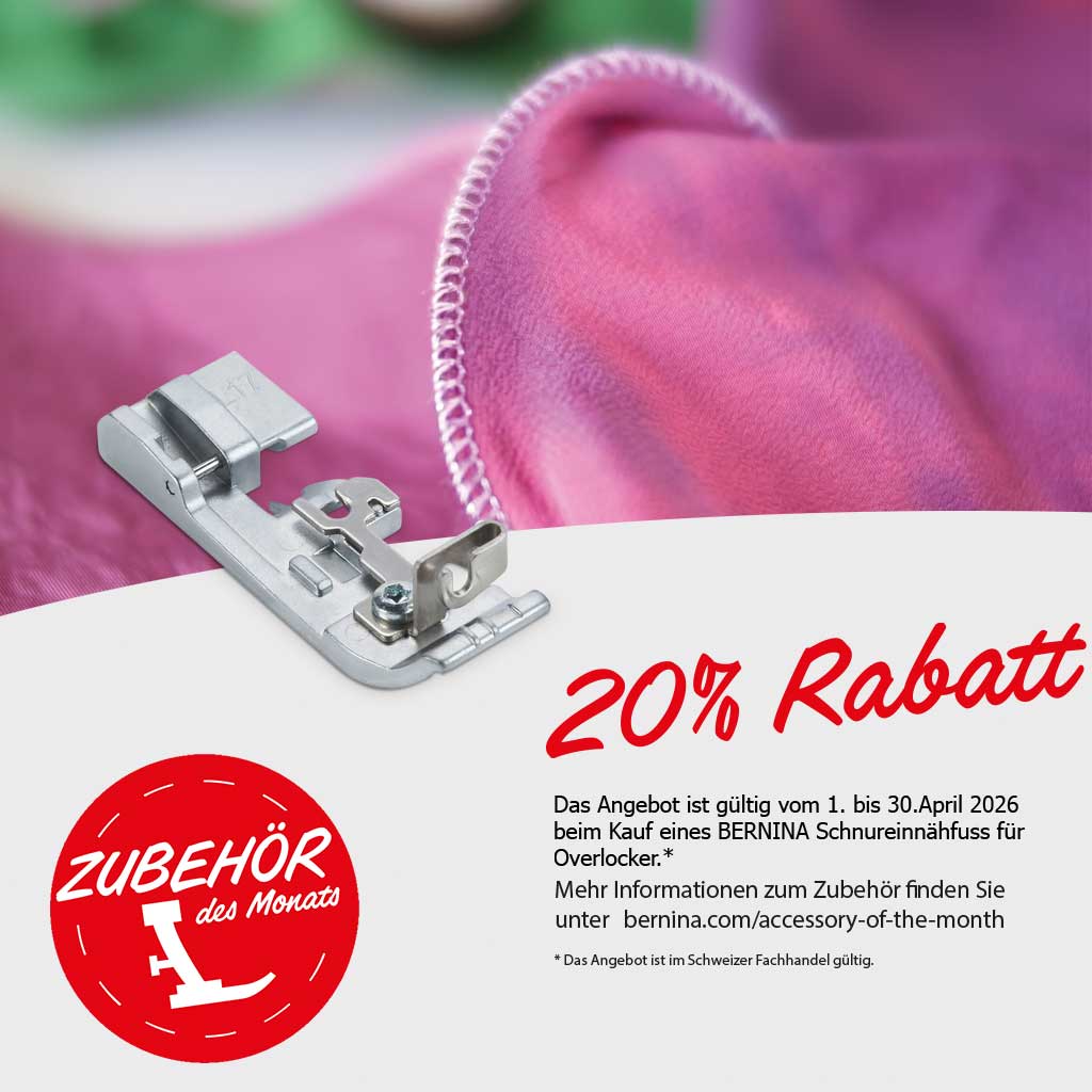 Es entstehen saubere, exakte Rollsäume mit hoher Verarbeitungsqualität. Der Schnureinnähfuss ist ausserdem ein praktisches Hilfsmittel zum Anfertigen von verstärkten Kanten und vorstehenden Volants. Auch formbare Maschenbänder sind mit ihm im Handumdrehen genäht.