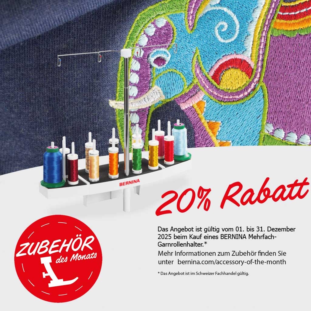 Der Mehrfach-Garnrollenhalter lässt sich ohne viel Aufwand an den verschiedensten Nähmaschinen befestigen und problemlos auch täglich zwischen zwei Maschinen wechseln. Insgesamt bietet der Halter Platz für 15 Garnrollen und ermöglicht so einen schnellen Zugriff auf unterschiedlich farbige Garne. Die Herausnahme einzelner Garnstifte aus dem Mehrfach-Garnrollenhalter schafft bei Bedarf Platz für grössere Garnrollen sowie Garn-Konen. Näh-, Stick- und Quilt-Projekte sind damit effizienter realisierbar.